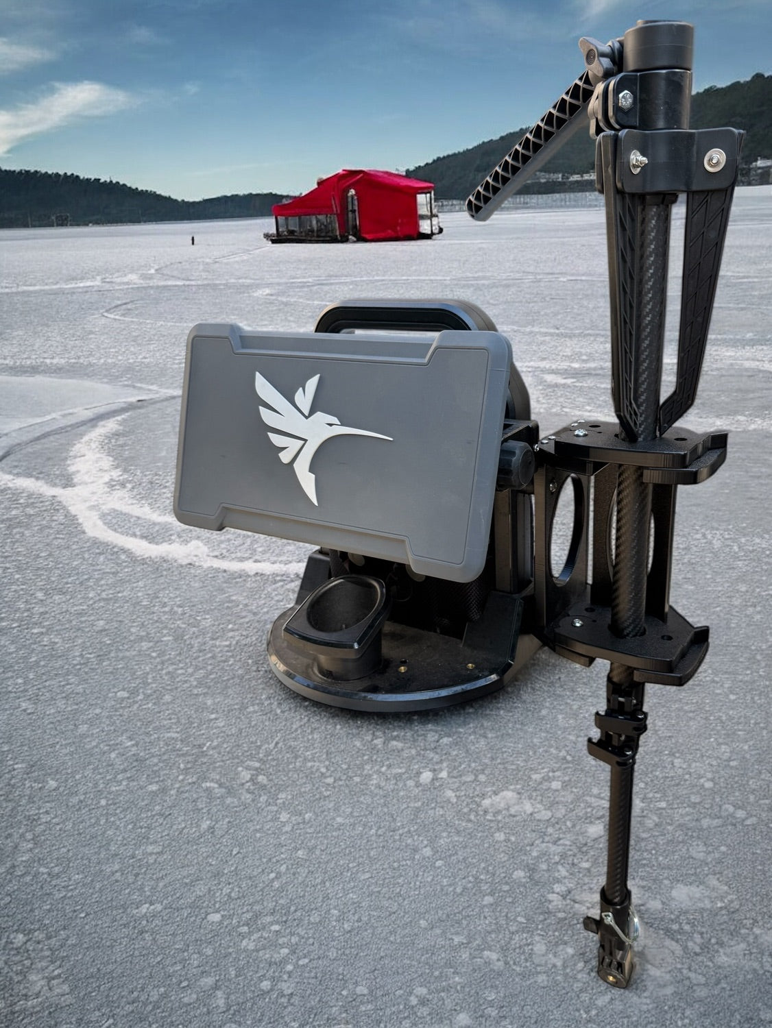 The Sidewinder is a compact design for the angler wanting to use FFS in a run-and-gun scenario. Its unique, patent-pending design connects the transducer pole directly to the ice shuttle in an orientation that allows the user to utilize a single ice hole for both fishing and FFS deployment while keeping the screen in great view for all of the action.