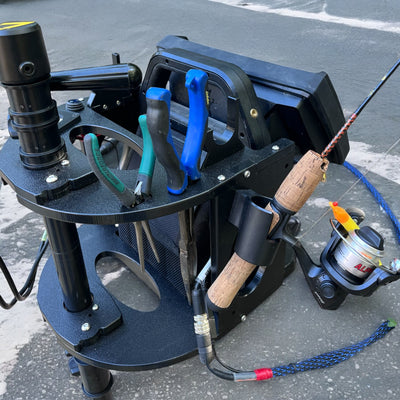 Attach the Shuttle Buddy to your Helix ice shuttle and the MegaLive/Mega360 transducer pole can be locked into the unique turret so everything can be handled as one unit.